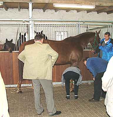 Bevor eine Stute eingetragen wird, muß sie gemessen werden - Frau Sander bestimmt den Röhrbeinumfang.